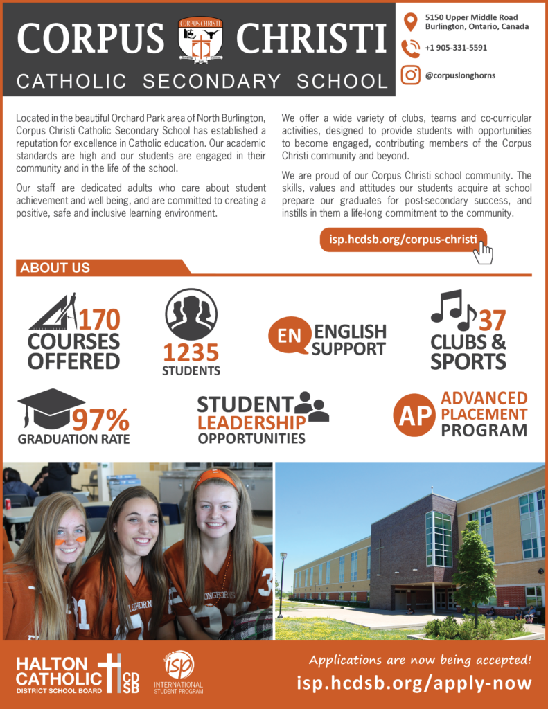 Located in the beautiful Orchard Park area of North Burlington, Corpus Christi Catholic Secondary School (CSS) has established a reputation for excellence in Catholic education. Our academic standards are high and our students are engaged in their community and in the life of the school.