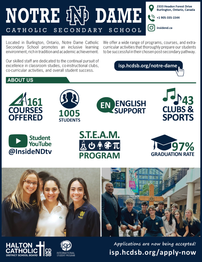 Located in Burlington, Ontario, Notre Dame Catholic Secondary School (CSS) promotes an inclusive learning environment, rich in tradition and academic achievement. Our skilled staff are dedicated to the continual pursuit of excellence in classroom studies, co-instructional clubs, co-curricular activities, and overall student success.